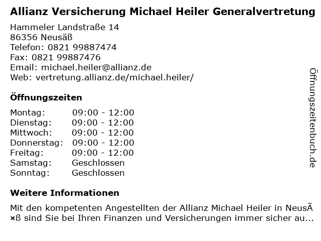 2 Allianz Versicherung Enrico Cestonaro e.K. Generalvertretung (Entfernung: 2,88 km) Am Kobelgraben 8, 86356 Neusäß 3 Allianz Versicherung Franz Siegert Generalvertretung (Entfernung: 4,19 km) Wernher-von-braun-straße 3 a, 86368 Gersthofen 4 Allianz Versicherung - Generalvertretung Wollenburg und Krause (Entfernung: 4,67 km) Brunnenpl. 3, 86391 Stadtbergen 5 Allianz Versicherung Enrico Cestonaro e.K. Generalvertretung (Entfernung: 6,89 km) Gallusbergle 9, 86152 Augsburg 6 Allianz Generalvertretung BERND und STEFAN SCHUSTER GbR (Entfernung: 8,12 km) Schertlinstraße 17 a, 86159 Augsburg |