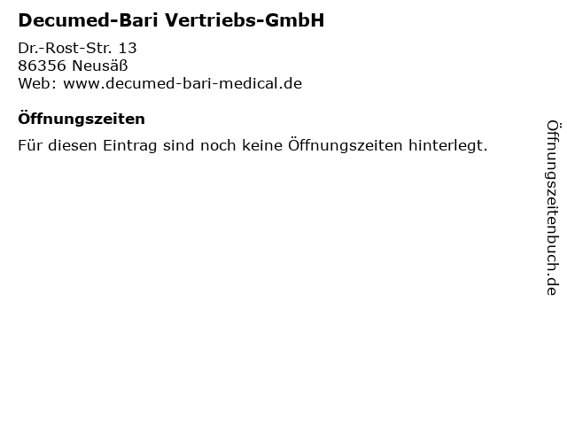 | Öffnungszeiten Decumed-Bari Vertriebs-GmbH in Neusäß anzeigen | |