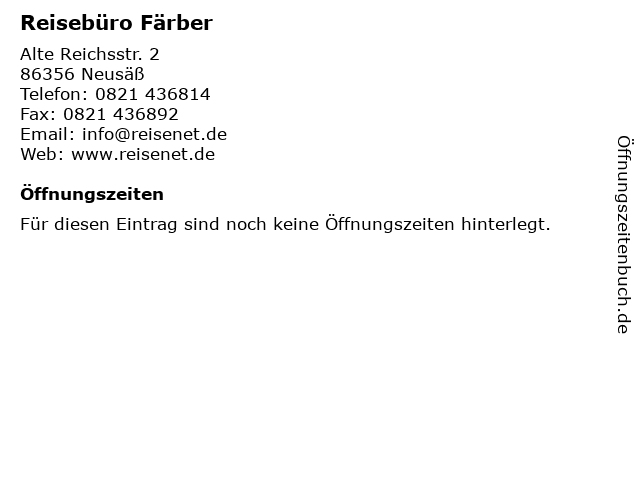 | Öffnungszeiten Reisebüro Färber in Neusäß anzeigen | |