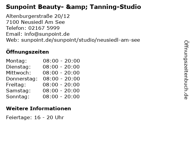 Branchen & Suchbegriffe zu Sunpoint Beauty- & Tanning-Studio:beauty, fitnessstudio, gesundheit, solarium, sonnenbaden, sport, studio, sunpoint, tanning, training |