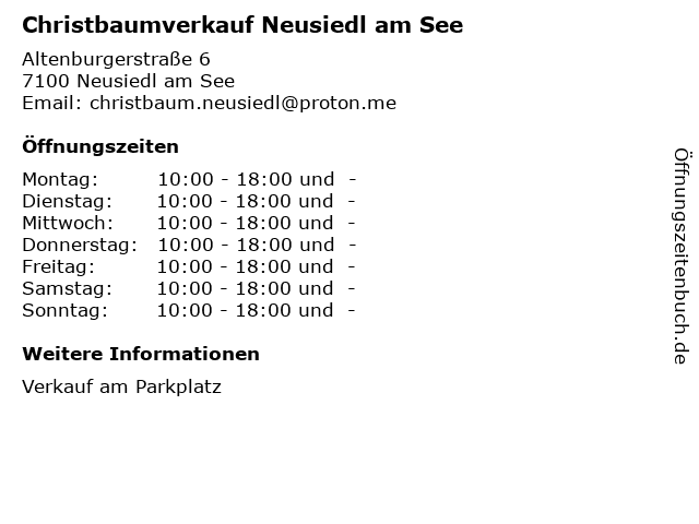 | Öffnungszeiten Christbaumverkauf Neusiedl am See in Neusiedl am See anzeigen | |