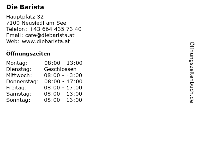 | Öffnungszeiten Die Barista in Neusiedl am See anzeigen | |