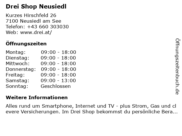 | Öffnungszeiten Drei Shop Neusiedl in Neusiedl am See anzeigen | |