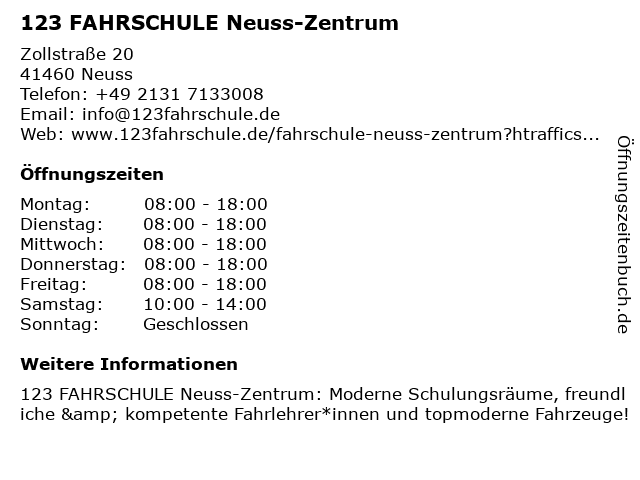 | Öffnungszeiten 123 FAHRSCHULE Neuss-Zentrum in Neuss anzeigen | |