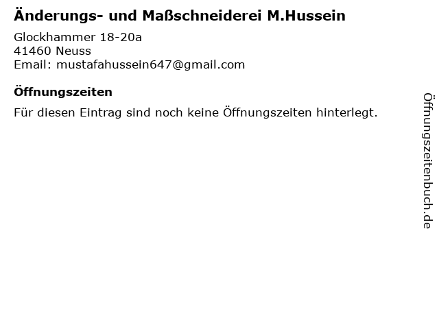 | Öffnungszeiten Änderungs- und Maßschneiderei M.Hussein in Neuss anzeigen | |