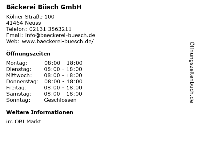 | Öffnungszeiten Bäckerei Büsch GmbH in Neuss anzeigen | |