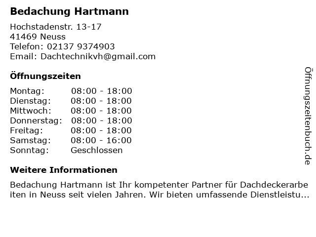 | Öffnungszeiten Bedachung Hartmann in Neuss anzeigen | |