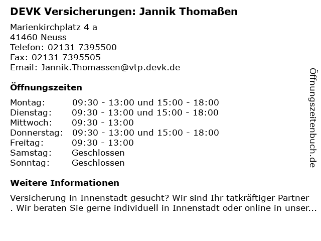 5 DEVK Versicherungen: Romario Gardner (Berater*in ausgeschieden) (Entfernung: 0,01 km) Marienkirchplatz 4 a, 41460 Neuss 6 |