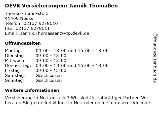 3 DEVK Versicherungen: Romario Gardner (Berater*in ausgeschieden) (Entfernung: 0,00 km) Thomas-mann-str. 3, 41469 Neuss 4 6 |