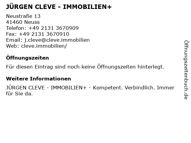 | Öffnungszeiten JÜRGEN CLEVE - IMMOBILIEN+ in Neuss anzeigen | |