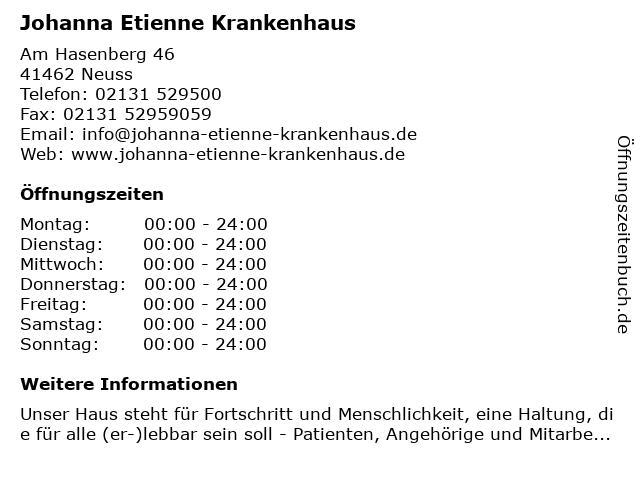 | Öffnungszeiten Johanna Etienne Krankenhaus in Neuss anzeigen | |
