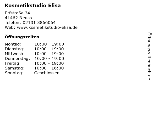 | Öffnungszeiten Kosmetikstudio Elisa in Neuss anzeigen | |