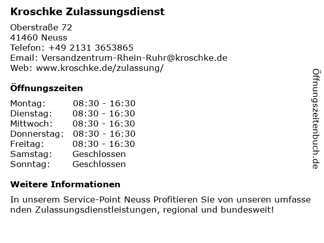 Öffnungszeiten Kroschke Zulassungsdienst in Neuss anzeigen | |