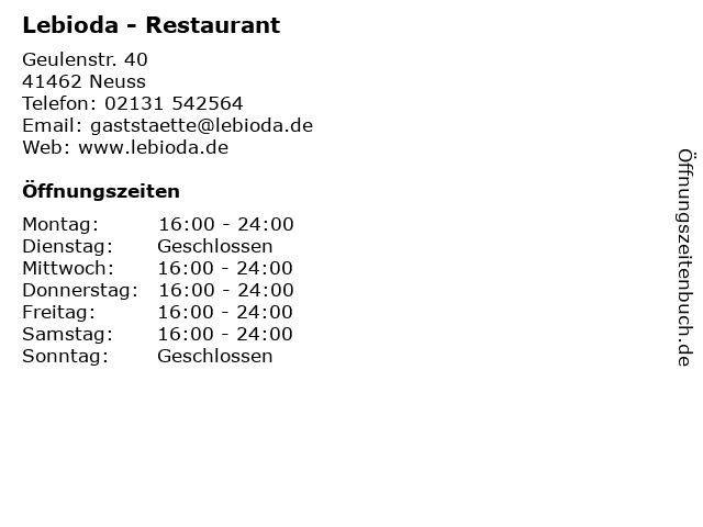| Öffnungszeiten Lebioda - Restaurant in Neuss anzeigen | |