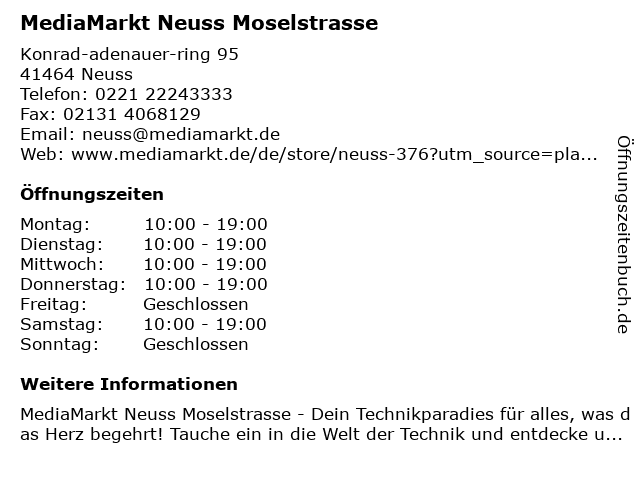 | Öffnungszeiten MediaMarkt Neuss Moselstrasse in Neuss anzeigen | |