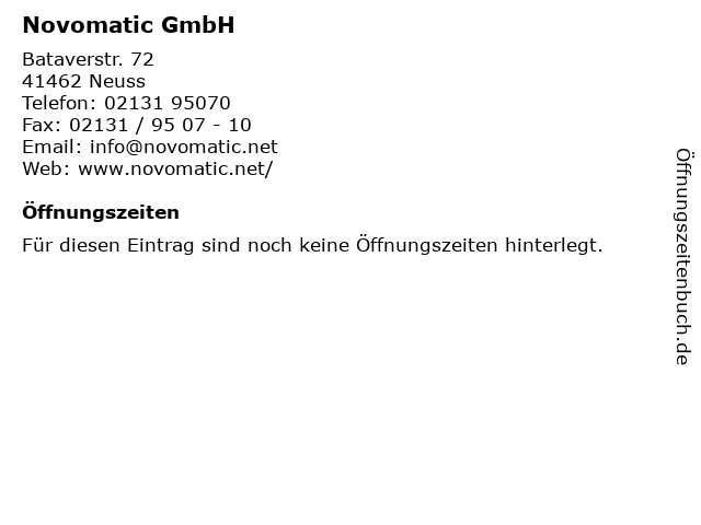 | Öffnungszeiten Novomatic GmbH in Neuss anzeigen | |