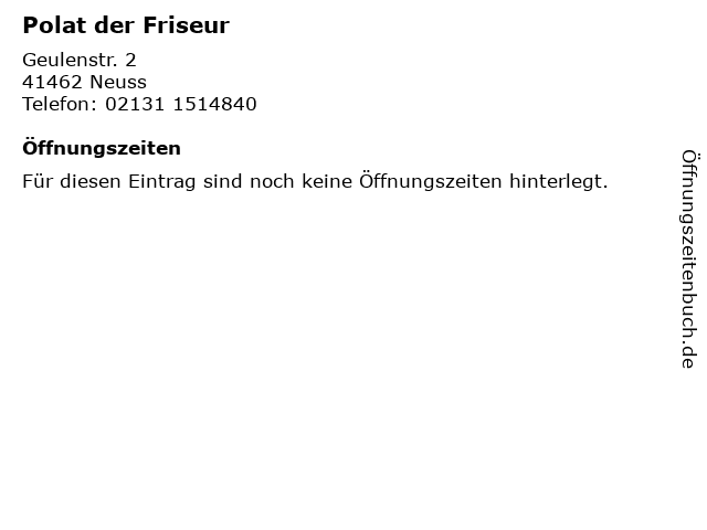 | Öffnungszeiten Polat der Friseur in Neuss anzeigen | |