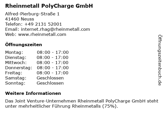 | Öffnungszeiten Rheinmetall PolyCharge GmbH in Neuss anzeigen | |