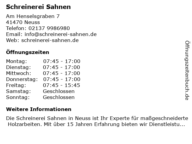 | Öffnungszeiten Schreinerei Sahnen in Neuss anzeigen | |