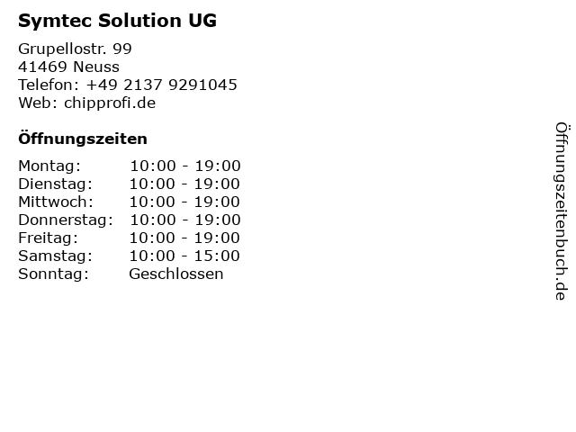 | Öffnungszeiten Symtec Solution UG in Neuss anzeigen | |