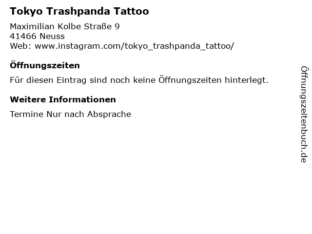 | Öffnungszeiten Tokyo Trashpanda Tattoo in Neuss anzeigen | |