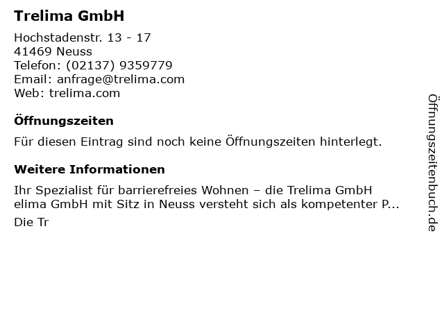 | Öffnungszeiten Trelima GmbH in Neuss anzeigen | |