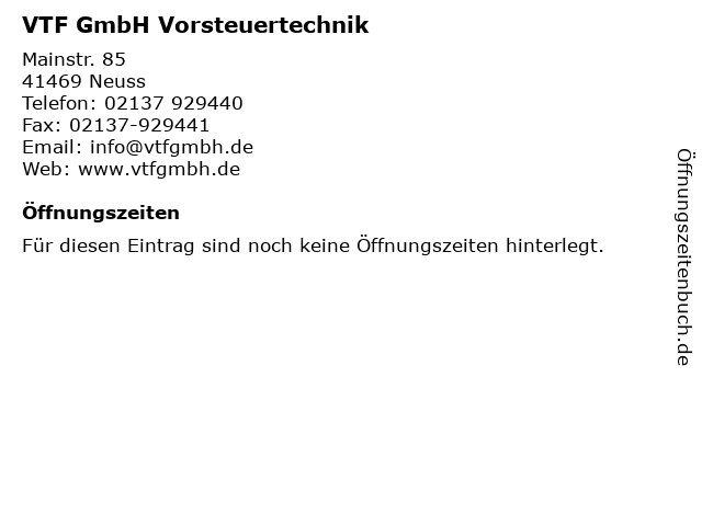 | Öffnungszeiten VTF GmbH Vorsteuertechnik in Neuss anzeigen | |