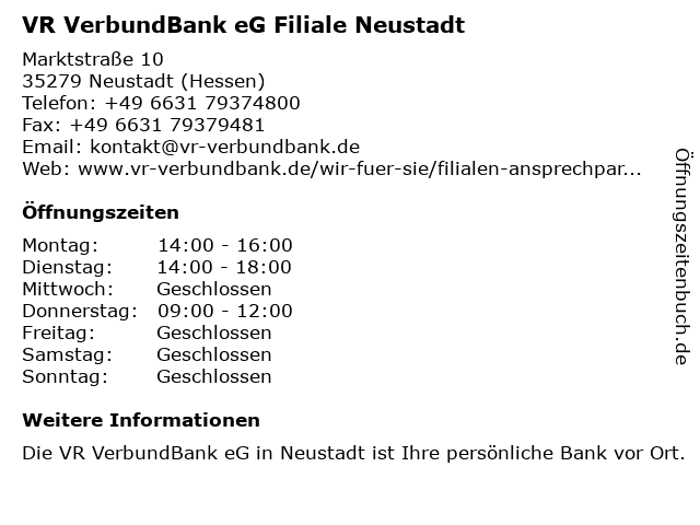 Branchen & Suchbegriffe zu VR VerbundBank eG Filiale Neustadt:altersvorsorge, bank, beratung, eg, geldanlage, geldautomat, girokonto, kontoauszugsdrucker, kredit, online-banking, tagesgeld, verbundbank, vr |