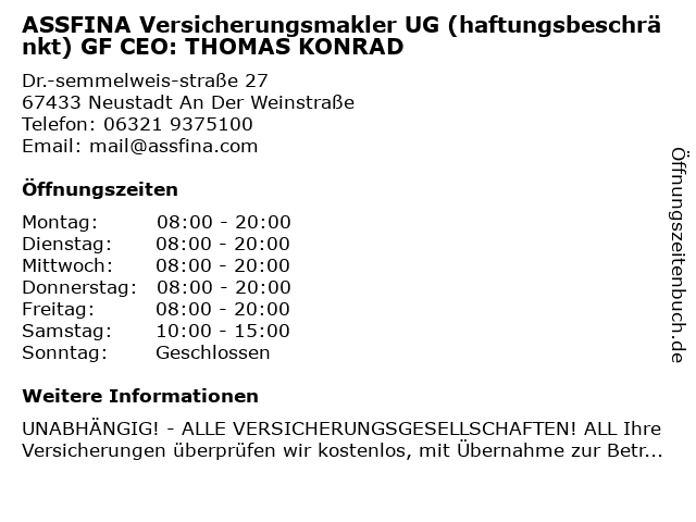 Branchen & Suchbegriffe zu ASSFINA Versicherungsmakler UG (haftungsbeschränkt) GF CEO: THOMAS KONRAD:assfina, ceo, gf, haftungsbeschränkt, konrad, thomas, ug, versicherungsmakler |