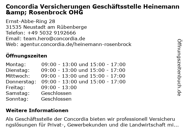 2 Concordia Versicherungen Geschäftsstelle Wedegärtner & Rösch (Entfernung: 6,36 km) Fritz-Langrehr-Straße 35, 30826 Garbsen 3 Gesangverein Concordia Klein Heidorn Gisela Rodloff (Entfernung: 8,39 km) Am Fuchsberg 21, 31515 Wunstorf 6 |