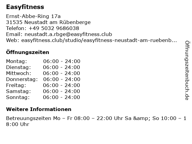 | Öffnungszeiten Easyfitness in Neustadt am Rübenberge anzeigen | |