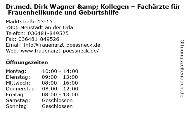 1 Dr. med. Markus Wagner - Orthopädie und Unfallchirurgie (Entfernung: 0,17 km) Markt 17, 07806 Neustadt An Der Orla 4 Dr. med. Christine Günther - Frauenheilkunde und Geburtshilfe (Entfernung: 10,72 km) Bodelwitzer Weg 7 a, 07381 Pößneck 6 |