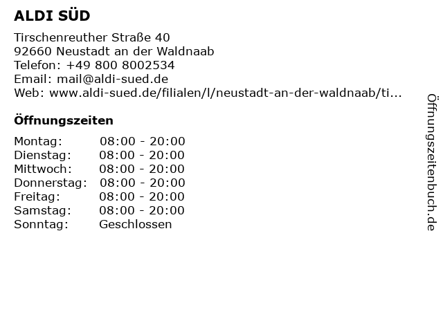 | Öffnungszeiten ALDI SÜD in Neustadt an der Waldnaab anzeigen | |