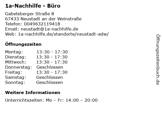 3 Studienkreis Nachhilfe Neustadt an der Weinstraße (Entfernung: 0,20 km) Exterstraße 7, 67433 Neustadt an der Weinstraße 4 Schülerhilfe Nachhilfe Neustadt a.d. Weinstraße (Entfernung: 0,46 km) Strohmarkt 1, 67433 Neustadt a.d. Weinstraße 6 |