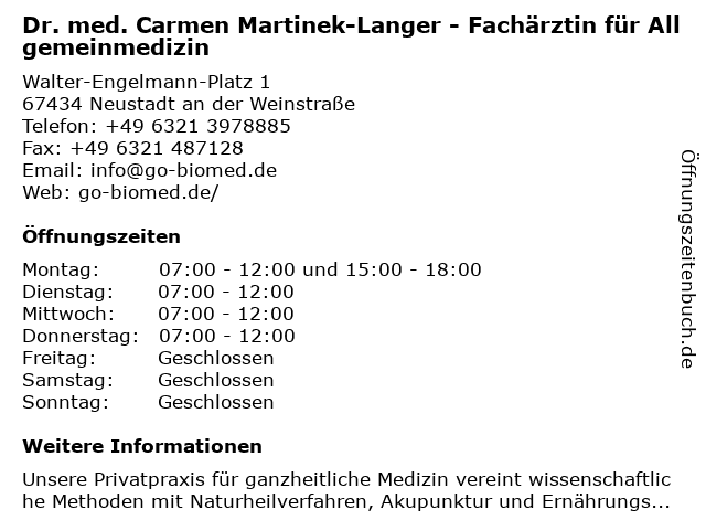 1 Dr.med. R. Abrolat Dr.med. K. Langer Fachärzte für Urologie (Entfernung: 0,03 km) Walter-Engelmann-Platz 1, 67434 Neustadt 3 Dr.med. Marina Schmitt Fachärztin f. Allgem.Chirurgie (Entfernung: 0,34 km) Lindenstr. 15, 67433 Neustadt 4 Dr. med. Csilla Danckwardt - Fachärztin für Augenheilkunde (Entfernung: 0,36 km) Schütt 2, 67433 Neustadt an der Weinstraße 5 Hausärztliche Praxis Dr. med. Petra Wendler, Fachärztin für Allgemeinmedizin (Entfernung: 0,40 km) Kellereistraße 1, 67433 Neustadt 6 Dr. med. Christel Robotham, Fachärztin für Innere Medizin und Kardiologie (Entfernung: 0,42 km) Hauptstraße 99, 67433 Neustadt |