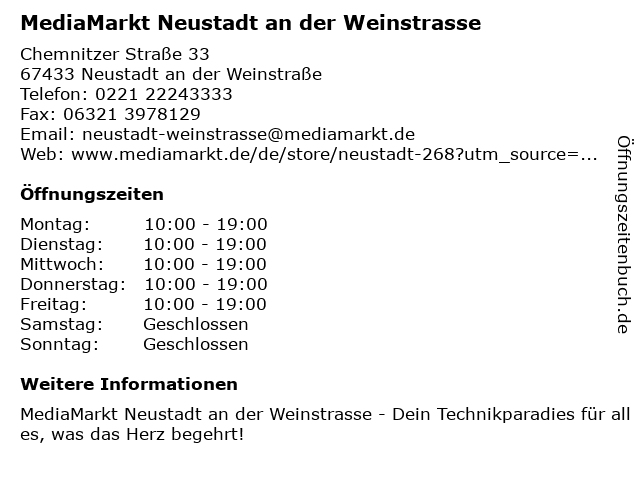 Branchen & Suchbegriffe zu MediaMarkt Neustadt an der Weinstrasse:an, anbieter für telekommunikationsgeräte, computergeschäft, geschäft für handyzubehör, geschäft für heimaudiosysteme, geschäft für videospiele, handyreparaturgeschäft, haushaltsgeräte, mediamarkt, mobiltelefongeschäft, weinstrasse |
