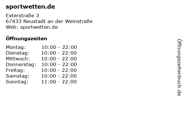 | Öffnungszeiten sportwetten.de in Neustadt an der Weinstraße anzeigen | |