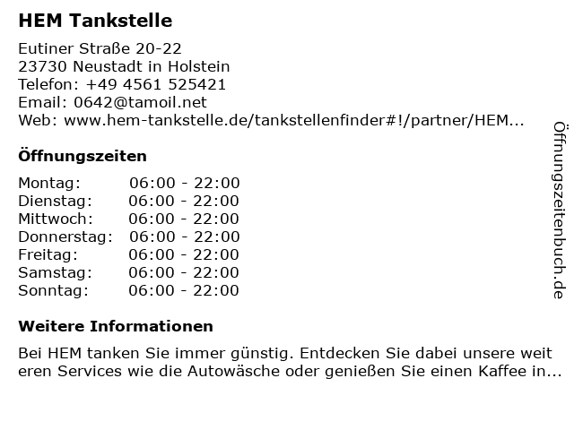 | Öffnungszeiten HEM Tankstelle in Neustadt in Holstein anzeigen | |
