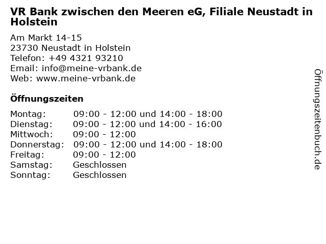 1 VR Bank zwischen den Meeren eG, Geldautomat Neustadt in Holstein (Entfernung: 0,00 km) Am Markt 14-15, 23730 Neustadt in Holstein 4 VR Bank Ostholstein Nord - Plön eG (Geldautomat) (Entfernung: 1,32 km) Rettiner Weg 77, 23730 Neustadt 5 VR Bank Ostholstein Nord - Plön eG (Geldautomat) (Entfernung: 3,56 km) Wiesenstraße 4, 23730 Neustadt 6 VR Bank Ostholstein Nord-Plön eG - Geschäftsstelle Schönwalde (Entfernung: 9,68 km) Eutiner Straße 3, 23744 Schönwalde |