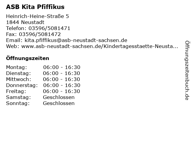 | Öffnungszeiten ASB Kita Pfiffikus in Neustadt anzeigen | |