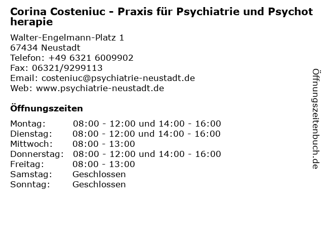 Branchen & Suchbegriffe zu Corina Costeniuc - Praxis für Psychiatrie und Psychotherapie:corina, costeniuc, persönlichkeitsstörung, praxis, psychiater, psychiatrie, psychotherapie |