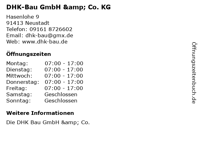 | Öffnungszeiten DHK-Bau GmbH & Co. KG in Neustadt anzeigen | |