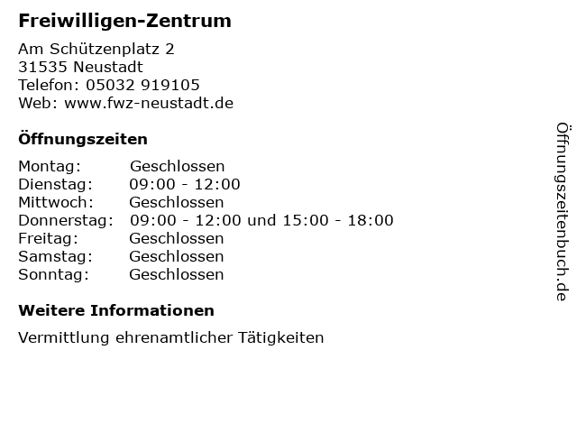 | Öffnungszeiten Freiwilligen-Zentrum in Neustadt anzeigen | |