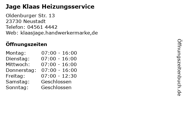 | Öffnungszeiten Jage Klaas Heizungsservice in Neustadt anzeigen | |