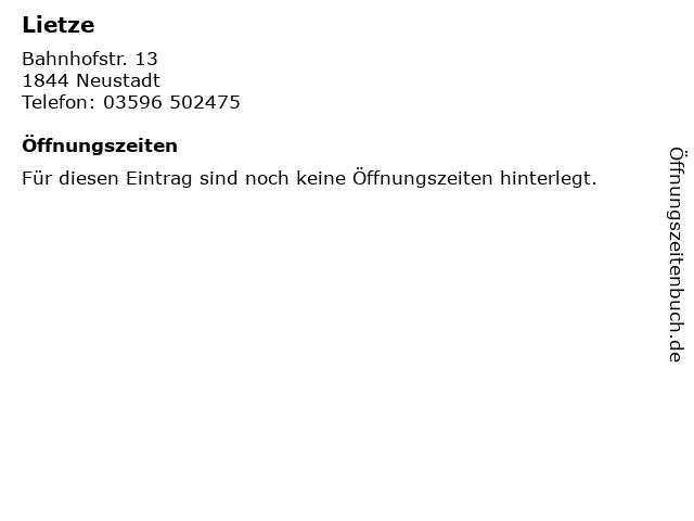 | Öffnungszeiten Lietze in Neustadt anzeigen | |