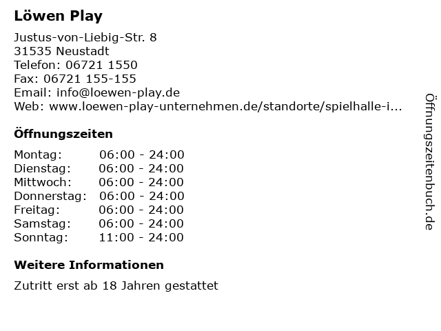 | Öffnungszeiten Löwen Play in Neustadt anzeigen | |