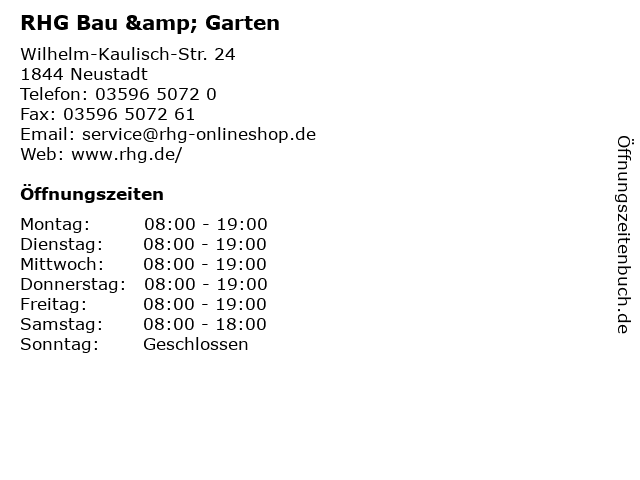 | Öffnungszeiten RHG Bau & Garten in Neustadt anzeigen | |