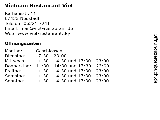 | Öffnungszeiten Vietnam Restaurant Viet in Neustadt anzeigen | |