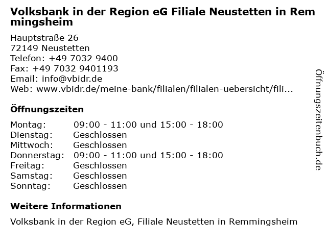 Branchen & Suchbegriffe zu Volksbank in der Region eG Filiale Neustetten in Remmingsheim:bank, beratung, eg, geldautomat, genossenschaft, immobilienagentur, kredit, neustetten, region, remmingsheim, versicherung, volksbank |