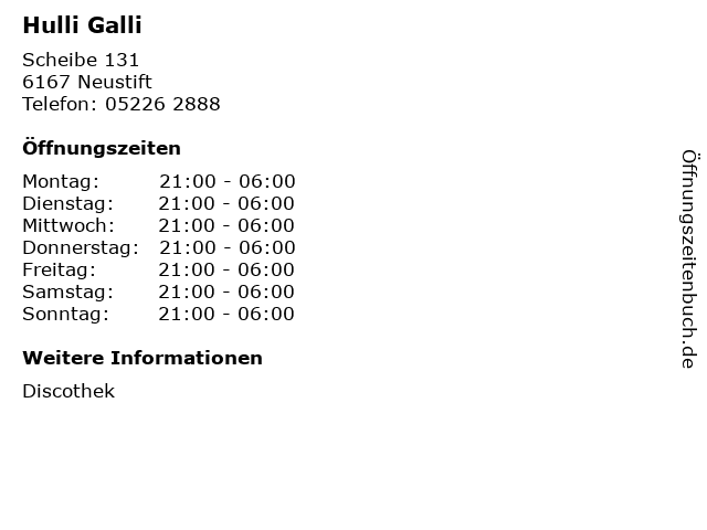 | Öffnungszeiten Hulli Galli in Neustift anzeigen | |